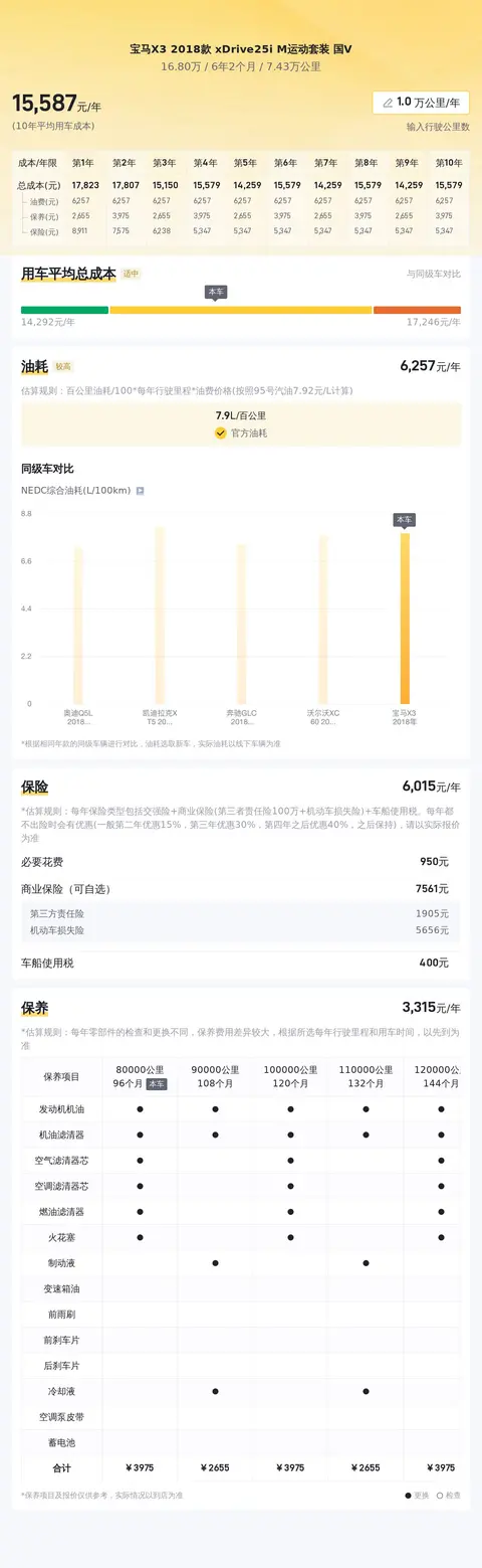 买车不是一阵子的事,而是长达几年甚至十几年的长期过程。除了要考虑买车成本,也要考虑用车成本。接下来,我们先来预估一下该车未来10年的平均用车成本。当然,如果您不开车或者开车很少的话,那么用车成本肯定也会很低。通过下方的图片,我们可以看到该车未来10年的平均用车成本大概是16180元/年。