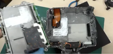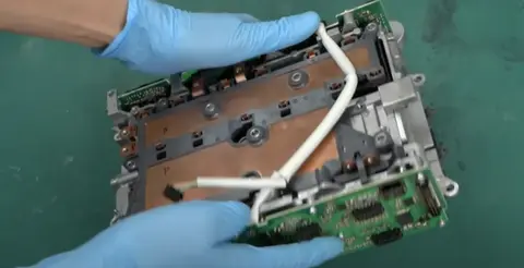 接着,继续拆。该逆变器的主要组件可以作为一个整体进行分离。在主要部件的最下面,包含一个柔性电路(FPC),柔性电路与输入端相连,车辆的其他单元会发送信号来控制该逆变器,这些信号通过该电路传输。