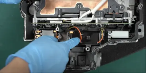 拆下母线。母线下方有两个薄膜电容器,一个较大,一个较小。小型薄膜电容器由Nichicon(尼基康)制造,而较大的薄膜电容器同样由Nichicon生产,并涂有硅脂以增强散热性能。