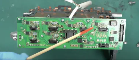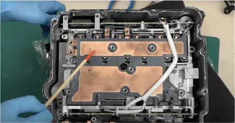 现在,我们可以看到三个功率半导体模块。您可以移除这些模块的盖子,揭开模块内部结构。这些模块通过直流母线与功率半导体连接,而直流母线排在之前拆卸逆变器盖时也曾见过。直流母线与功率半导体模块最初是通过钎焊或焊接连接的,但为了便于拆卸,已被切开。其他连接也同样被切开。移除母线后,背面没有其他特别的结构。