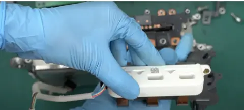 接下来,我们拆卸栅极驱动板,可以看到白色电流传感器。这些传感器用于检测电机电流,分别对应U、V、W三相电流。您可以将这些传感器与母线分离,传感器通过三层母线连接。导热片也与母线连接,用于提高散热性能。传感器由LEM公司制造,这是一家在行业内非常知名的公司。