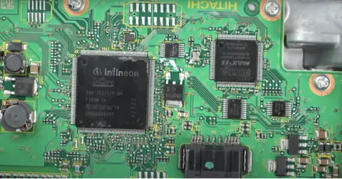 下图是控制板的主要部分,使用了两个IC:Infineon(英飞凌)微控制器和Altera FPGA。推测控制操作主要由Infineon微控制器执行,而辅助操作则由FPGA处理。这里还有HITACHI的标志,设计非常优雅。