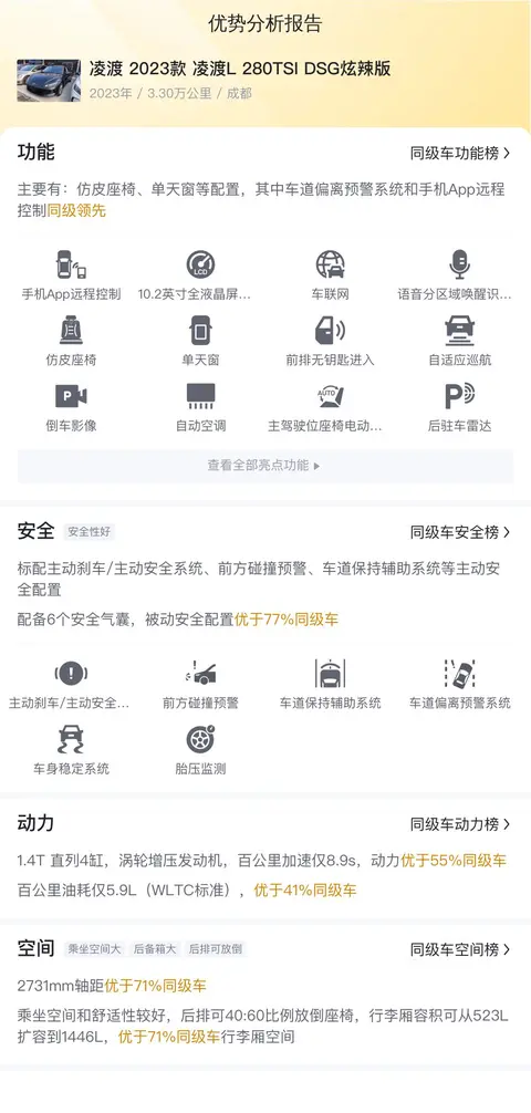 凌渡 2023款 凌渡L 280TSI DSG炫辣版的配置一般,配备了单色车内氛围灯、手机App远程控制、语音分区域唤醒识别、OTA升级、手机无线充电等配置。安全配置上,标配主动刹车/主动安全系统、前方碰撞预警、车道保持辅助系统等主动安全配置,配备6个安全气囊,被动安全配置优于77%同级车。