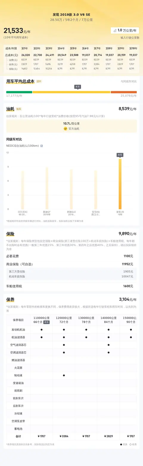 关于用车成本方面,根据估算,这辆车的年均综合用车成本约2.2万元左右。当然,这个费用还是要根据车主的实际使用情况而有所不同。