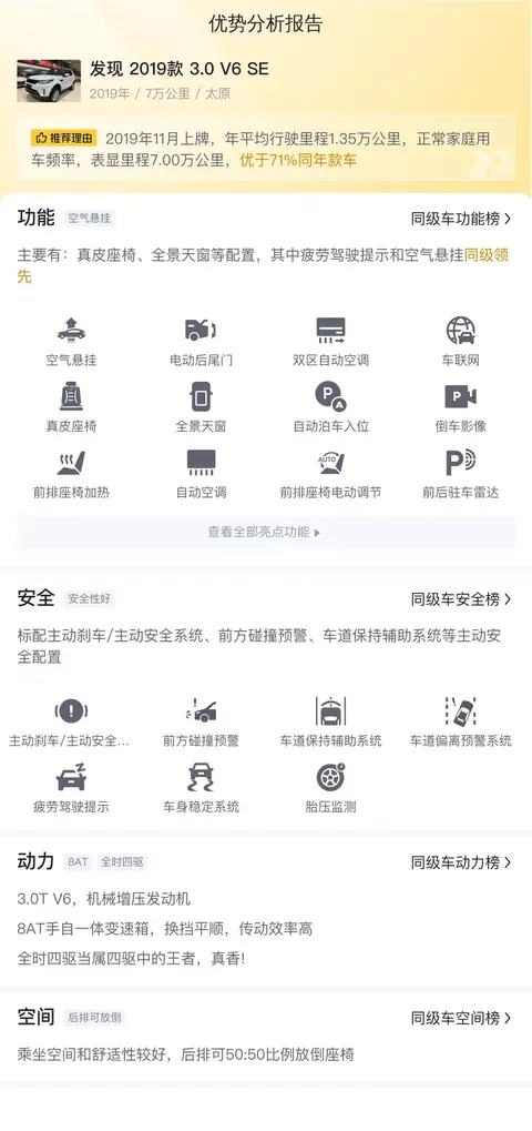 发现(图片|配置|询价)是一款极具代表性的豪华SUV,它不仅承载了路虎品牌一贯的越野精神,更在日益激烈的市场竞争中,以其独特的魅力和卓越的性能,吸引了众多消费者的关注。2018年11月16日,路虎(进口)官方正式对外发布了发现,2019款共5款全新车型。官方公布的新车指导价为66.98-93.48万元。本次上市是发现旗下车型的小改款。今天我们就为您带来一辆二手路虎发现,看看这辆车是否还能让您发现惊喜。先说一下这辆车的基本信息,该车的具体版本是——发现 2019款 3.0 V6 SE,上牌日期2019年11月,表显里程7万公里,白色车身,二手车报价28.5万,上牌地、车源地均为太原,过户次数2次。