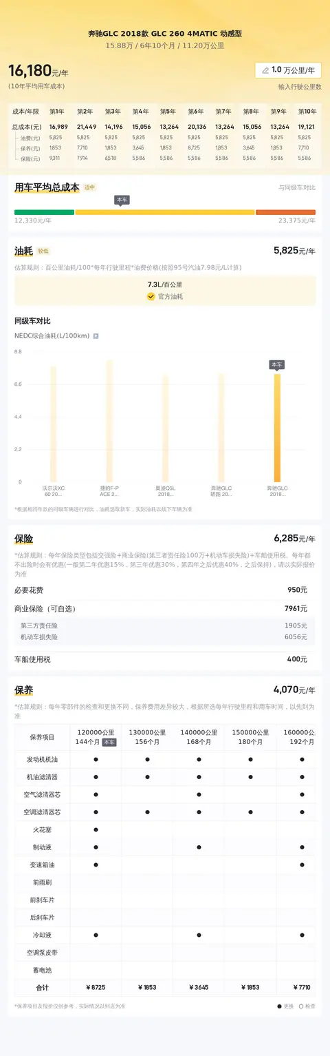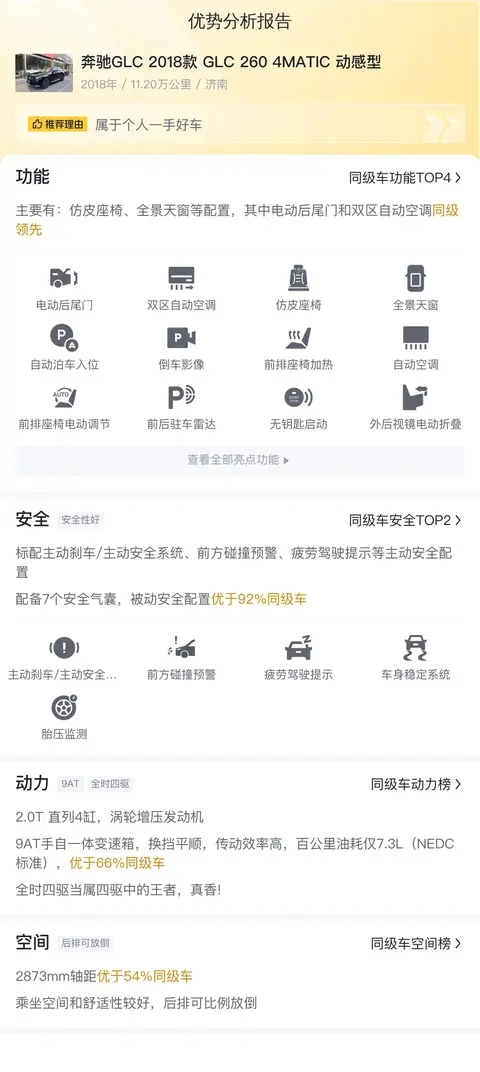 按照懂车帝的统计,这款车的热度不错,排名全国中型SUV销量榜第3位,可能跟这款车是奔驰GLC家族成员有关,毕竟奔驰的四驱系统还是有着不错的用户口碑。这款车目前的二手车报价是15.88万,预计再行驶2年后可卖12万,折价3.88万,年平均折价1.94万。