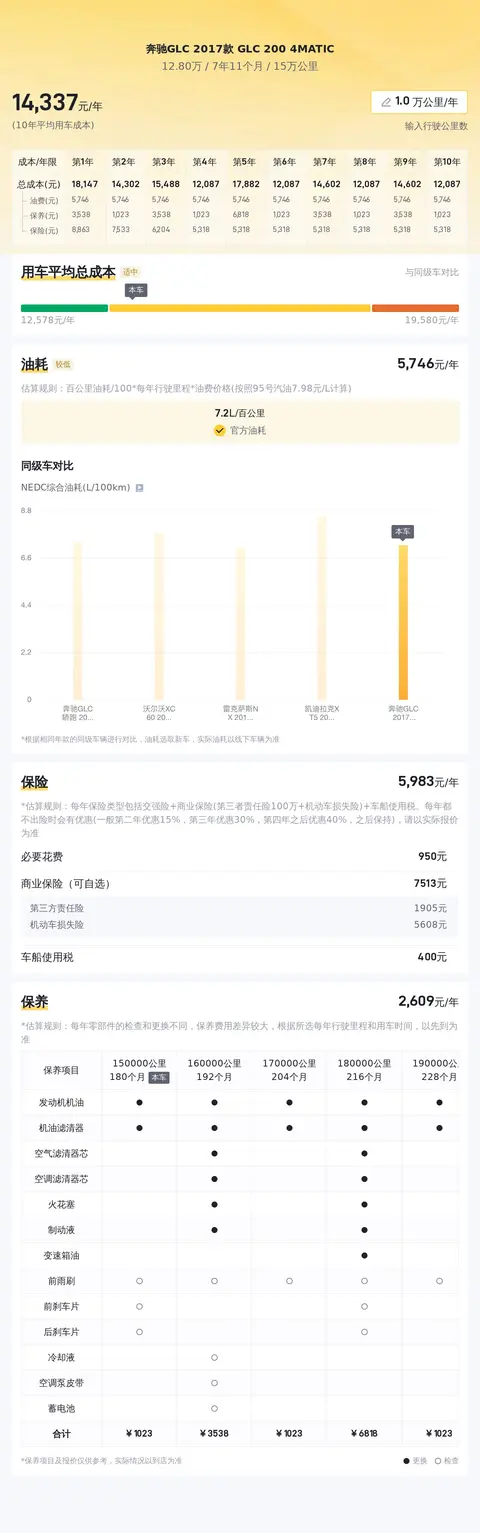 此外,根据估算,这辆车的用车成本也相对较高,因为同级车的最低用车成本是11446元/年,最高是18430元/年,奔驰GLC 2017款 GLC 200 4MATIC是14187元/年。