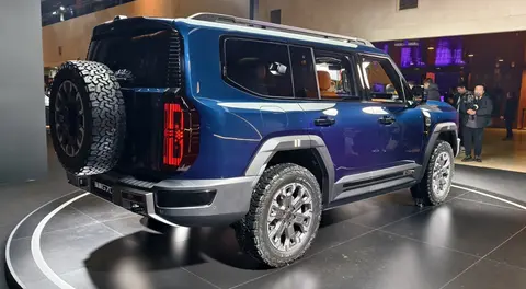 从车身侧面来看,新车延续了方正的车体姿态,前后轮眉造型宽敞。现场拍摄的车型配备多辐式轮毂,并搭载AT轮胎。新车的长宽高分别为5198毫米、2050毫米、1936毫米,轴距为3100毫米。车辆尾部配备外挂备胎,两侧竖状LED尾灯支持灯语功能。