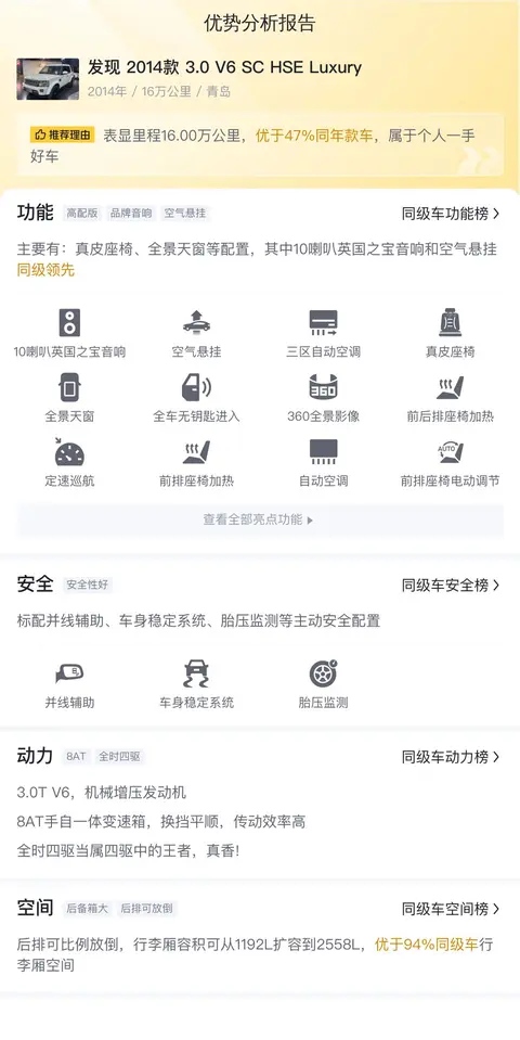 发现 2014款 3.0 V6 SC HSE Luxury 的主驾座椅支持电动调节和加热功能,甚至还有座椅记忆,进一步提升了驾驶的舒适性和便利性。后排座椅可以比例放倒,为乘客提供了更加灵活的空间布局。行李厢容积可从1192L扩容到2558L,优于94%同级车行李厢空间。全景天窗不仅增加了车内的采光,还提升了车内的空间感受,让乘客在旅途中能够享受到更加开阔的视野。自动空调系统确保了车内的恒温舒适,而车载冰箱的加入则让乘客在炎炎夏日能够随时享受到冰镇饮料的清凉。无钥匙启动系统免去了驾驶者频繁取放钥匙的烦恼,提升了日常使用的便利性。车载冰箱、第二排电动调节、后排液晶屏、空气悬架同级领先。