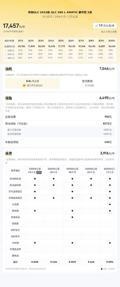 根据懂车帝平台的大数据分析,这款二手奔驰一年的平均用车成本大约为16673元,这其中包括油耗、保险以及保养等费用。具体的实际费用开销可能会根据车主的使用习惯及所在地的物价水平等因素有所不同。