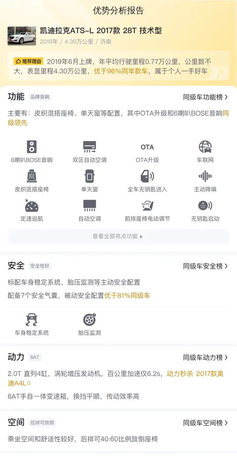 车况说完了,我们来看看这辆车的配置部分。该车配备了皮织混搭座椅、单天窗等配置,其中OTA升级和6喇叭BOSE音响同级领先。值得一提的是,它的后排座椅可以40:60比例放倒,不仅乘坐空间宽敞,还能根据需要调整行李舱空间,实用性很强。无论是家庭出行还是长途旅行,都能轻松应对。在安全配置方面,这辆车的整体安全系数表现一般,其主动刹车和前方碰撞预警功能优于50%的同级车,但被动安全配置则相对较低,仅优于17%的同级车型。尽管如此,凯迪拉克ATS-L 2017款 28T 技术型在主动安全配置上的出色表现仍然为驾驶者提供了及时有效的安全保障,使得驾驶过程中更加安心。