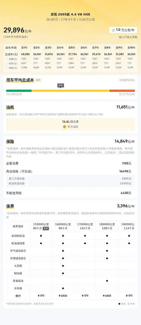 根据大数据分析显示,目前市场上这款车型的二手车价格区间大致在 31.2 万元至 38.21 万元之间。当然,具体的售价还会受到车辆状况等因素的影响。至于用车成本方面,根据估算,这辆发现 2005款 4.4 V8 HSE 的年均综合用车成本大约在每年 3 万元左右。这一数据仅供参考,实际费用可能会因个人使用习惯和维护情况而有所不同。