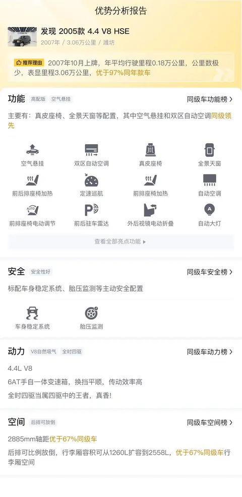 在选购二手车时,了解车辆的全面情况至关重要。今天,我们向您介绍的是一辆发现 2005款 4.4 V8 HSE,它以其卓越的越野性能、豪华的内饰配置和宽敞的车身尺寸赢得了市场的认可。根据目前的市场行情,这款车型的二手车价格区间大致合理。然而,在做出购买决策之前,我们建议您亲自查看车辆,确保其状况符合您的期望。同时,考虑到长期使用的角度,您还需要评估用车成本、维护便利性等因素。最后,我们衷心希望每位购车者都能找到适合自己需求的爱车,并享受愉快的驾乘体验。