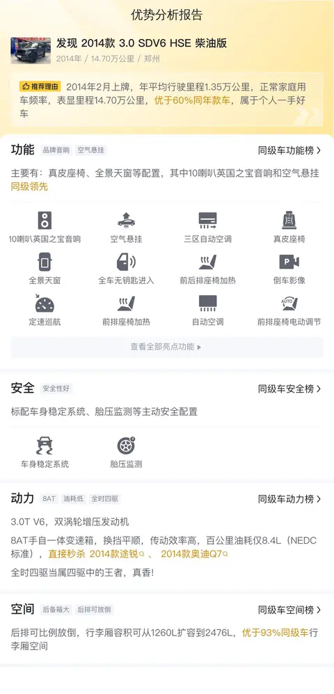 接下来,我们来详细了解一下这款2014款3.0 SDV6 HSE柴油版发现的具体配置。该车搭载了一台3.0升V6涡轮增压柴油发动机,能产生249马力的最大功率和600牛·米的峰值扭矩,确保车辆在各种路况下都能表现出色。与之匹配的是8速手自一体变速箱,换挡平顺,进一步提升了驾驶的舒适性和燃油经济性。在底盘和悬挂系统方面,这款车采用了多连杆式独立悬挂系统,配合空气弹簧,不仅能有效过滤路面颠簸,还提高了乘坐的舒适度。在驱动方式上,全时四驱系统结合托森式中央差速器,使得这款车在复杂路况下的通过性和稳定性得到了极大提升,让驾驶者能够轻松应对各种挑战。在制动系统上,前后通风盘式制动器搭配ABS防抱死系统和EBD制动力分配系统,确保了车辆在紧急制动时的安全性和稳定性。在主被动安全辅助配置上,该车不仅配备了全方位的气囊和稳定控制系统,还拥有上坡辅助和陡坡缓降等功能,进一步提升了驾驶的安全性和便捷性。在舒适配置上,这款车拥有真皮座椅、全景天窗等豪华配置,为乘客提供了更加舒适和宽敞的乘坐空间。在智能互联方面,蓝牙连接和外接USB接口等配置让乘客能够轻松享受数字化的驾乘生活。在空间表现上,这款车的后排座椅可以比例放倒,使得行李厢容积能够在1260L至2476L之间灵活调整,满足不同乘客的储物需求。