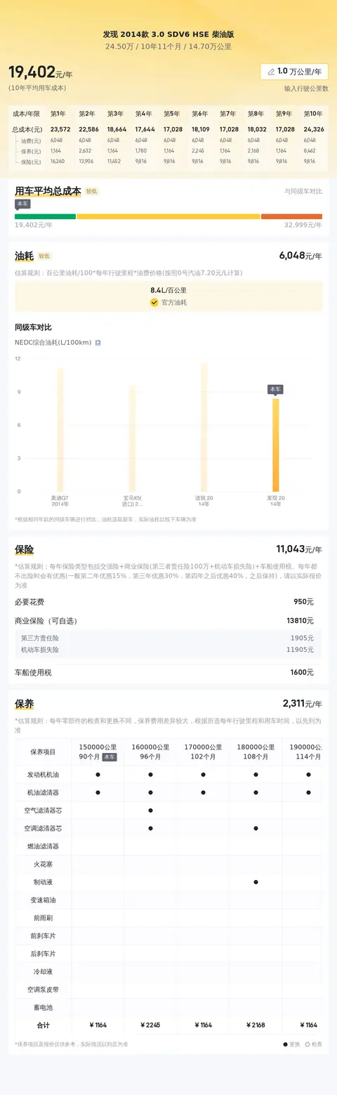 市场行情显示,这款2014款3.0 SDV6 HSE柴油版发现的二手车价格在24.5万左右。关于用车成本方面,根据估算,该车的年均综合用车成本约为1.9万元,这一数字在同级别车型中处于较高水平。需要注意的是,实际用车成本可能会因多种因素而有所不同。考虑到这款车的性能表现和豪华配置,这样的用车成本是可以理解的。但是,购买者仍然需要根据自身的经济实力和用车需求来权衡这一成本。