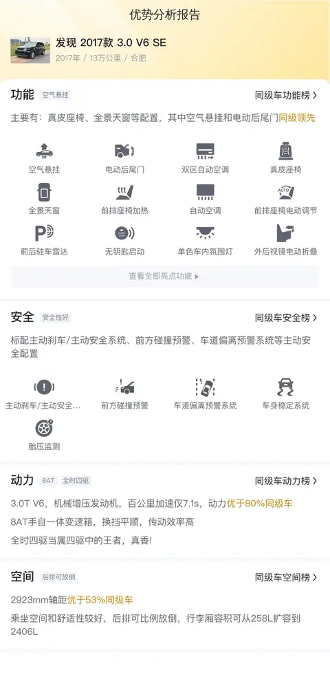 这辆二手发现 2017款 3.0 V6 SE车源地和上牌地都是合肥,2017年12月上牌,有1次过户记录。新车指导价84.8万,二手车报价24.98万,约新车落地的3成。截至目前,该车行驶里程为13万公里,还能用好多年。