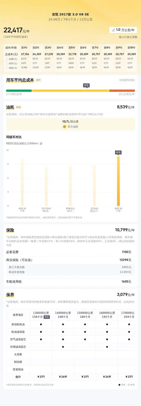 选择购买二手车时,不仅要考虑购车时的支出,还要纳入长期使用的各种费用。基于这一考虑,我们详细分析了这款车型的平均使用成本,以及与同级别其他车型之间的对比情况,同样用图片清晰展示。