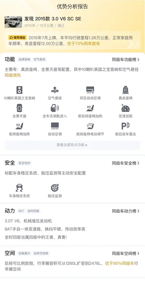 功能配置方面,这辆车配有真皮座椅、全景天窗等配置,其中10喇叭英国之宝音响和空气悬挂同级领先,3.0T V6,机械增压发动机,8AT手自一体变速箱,换挡平顺,传动效率高,全时四驱当属四驱中的王者,真香!后排可比例放倒,行李厢容积可从1260L扩容到2476L,优于95%同级车行李厢空间。