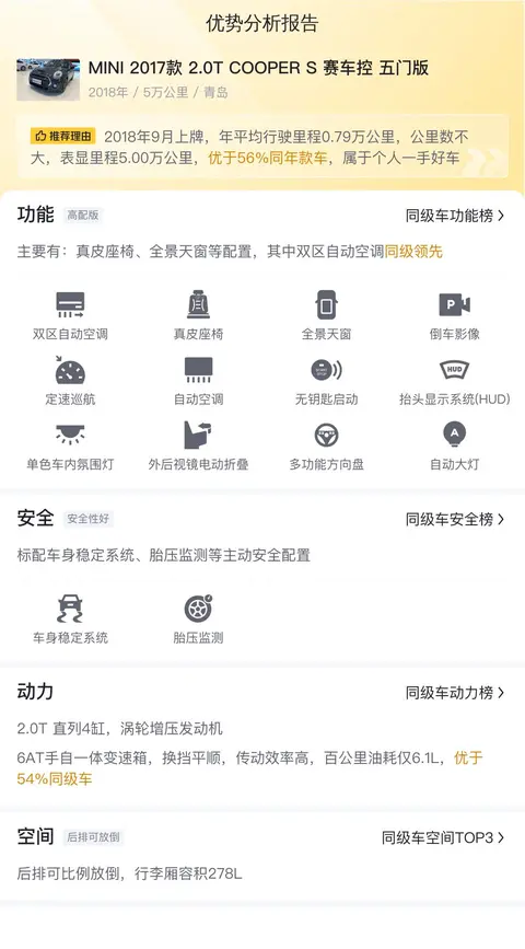 综上所述,这辆二手MINI 2017款 2.0T COOPER S 赛车控 五门版,不仅有着个性十足的外观和色彩搭配,更有着强劲的动力和良好的操控性能,可以满足不同驾驶场景的需求。车内空间比看着宽敞,座椅舒适,智能互联功能也挺全,不管是日常通勤还是周末出游,都能给你和朋友们带来不错的乘坐体验。而且,作为二手MINI,它那独特的复古时尚风格和调性,绝对能让你在朋友圈里赚足眼球!喜欢就拿下吧!