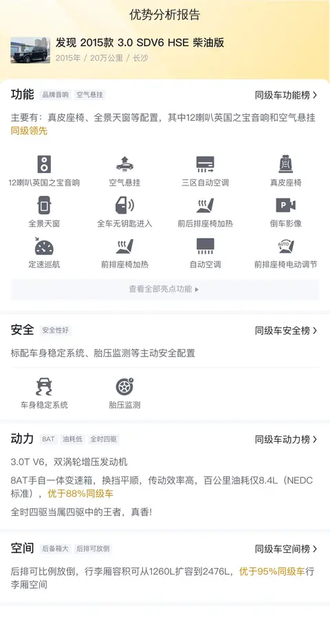 在配置方面,该车拥有真皮座椅、全景天窗等配置,其中12喇叭英国之宝音响和空气悬挂同级领先。值得一提的是,该车配备了方向盘加热、前排座椅记忆等功能,提升了驾乘舒适度。多媒体方面,配备单碟CD和多媒体接口,保证了娱乐需求。安全性上,全车支持无钥匙进入,同时配备多项安全保障措施,让您驾驶更安心。在舒适性配置上,该车采用了自动空调控制系统,相比手动空调,能更精准地维持车内温度恒定,提升乘坐的舒适度。此外,该车还配备了高级音响系统,允许你调整音量、低音、中音和高音,以及音乐的强度,以获得最佳的听觉享受。无论是长途旅行还是日常驾驶,你都可以找到最适合你的音乐设置,让驾驶体验更加愉悦。得益于2885mm的轴距和1915mm的车身宽度,该车内部空间比较宽敞,乘坐舒适性有保障。后排座椅可比例放倒,行李厢容积可从1260L扩容到2476L,优于95%同级车行李厢空间。动力方面,搭载3.0T V6,双涡轮增压发动机,8AT手自一体变速箱,换挡平顺,传动效率高,百公里油耗仅8.4L(NEDC标准),优于88%同级车,全时四驱当属四驱中的王者,真香!