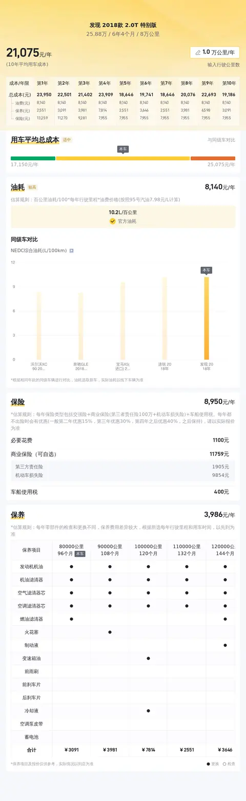 根据估算,发现 2018款 2.0T 特别版的年均综合用车成本大概在每年2.1万元左右,这项花销是跟车主的实际用车场景和使用强度有直接变化的。