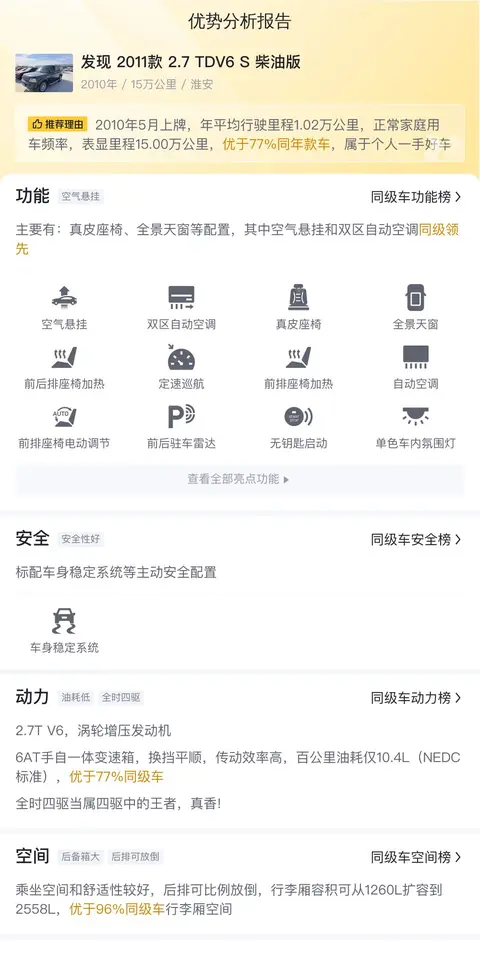 今天我们要为大家介绍的是一辆发现 2011款 2.7 TDV6 S 柴油版,这辆车的上牌日期为2010年5月,至今已经行驶了15万公里,它的车源地和上牌地都是淮安,车身颜色为绿色,该车并未有过过户记录。当时的新车指导价为69.8万,如今二手车报价仅为10.88万。