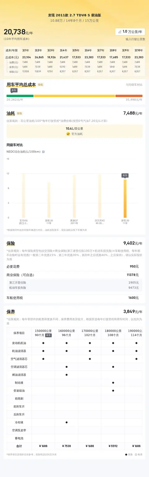 在用车成本方面,根据懂车帝的大数据分析,抛开保险和保养费用,这款车百公里油耗大约在10.4升左右。这辆车的10年平均用车成本大约在21278元/年,而同级车最低10年平均用车成本是19330元/年,最高是40718元/年,所以这款车的用车成本适中。