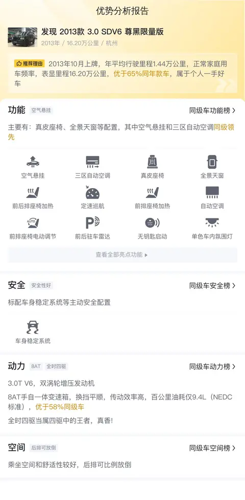 综上所述,发现 2013款 3.0 SDV6 尊黑限量版在动力、悬挂、座椅、天窗以及后排空间等方面表现出色。其市场行情和用车成本也相对合理。然而,在选择二手车时,请务必考虑车辆的具体状况、维修记录以及个人需求等因素。希望本文能够为您提供有价值的参考信息,助您做出明智的购车决策。
