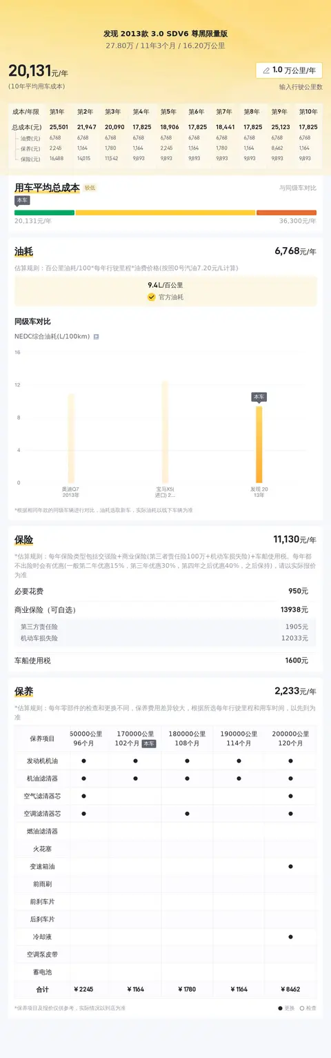 在市场行情方面,根据懂车帝的数据,发现 2013款 3.0 SDV6 尊黑限量版的二手车价格区间为20.15万至26.38万。具体售价因车辆状况而异。关于用车成本方面,该车的年均综合用车成本约为2万元左右。需要注意的是,实际费用可能会根据车主的使用习惯和保养情况而有所变动。