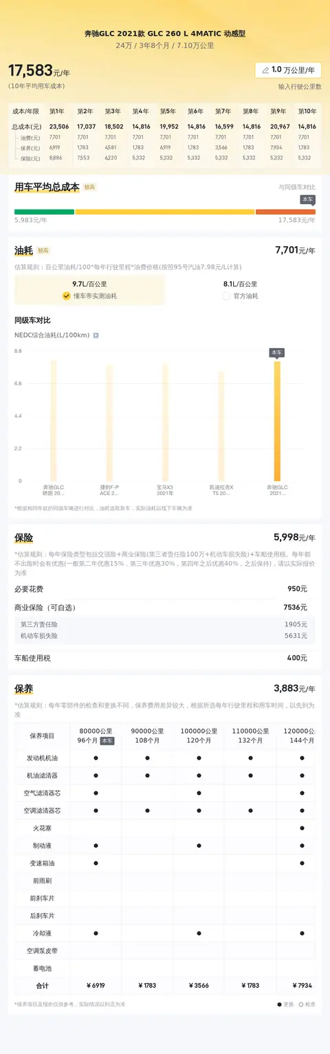 养车成本方面,根据懂车帝的数据,这款奔驰GLC 2021款 GLC 260 L 4MATIC 动感型的10年平均用车成本为18466元/年,相较于同级别的其他车型来说,处于较高值。这一点车主在购买前需要充分考虑自己的经济能力和用车需求,避免出现购车易、养车难的情况。当然,具体的用车成本还会受到多种因素的影响,包括车主的驾驶习惯、车辆的维护状况以及当地的消费水平等。
