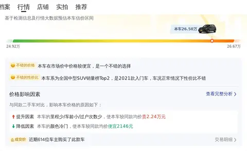这辆车目前售价26.5万,预计再行驶2年后可卖21万,约折价18.2%。根据市场行情,里程,少于均值0.9万公里,+4100元,车龄,少于均值1.2年,+16800元,过户次数,少于均值0.3次,+1500元,颜色,深灰色,-2146元,综合下来,价格还是比较合适的。