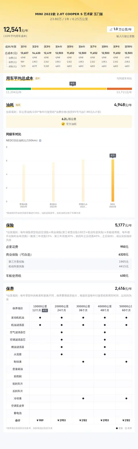 光是价格和保值率不行,还得看养车成本怎么样。根据大数据测算显示,同级车的最低10年平均用车成本是11364元/年,最高是14931元/年,而这辆二手MINI是13083元/年,属于正常用车成本,优势不明显,但胜在包涵了每年5000块左右的商业保险+交强险费用,还有500多的保养费,这一算是不是觉得又很香了?