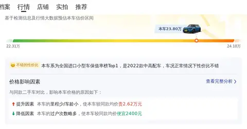 车况说完了,咱再看看车况好的背后,这辆二手MINI值不值这个钱。拿数据说话是最直接的,全国市场行情显示,同款二手MINI价格都在21.86-26.69万之间,而咱看的这辆报价23.8万,价格合理,但没有明显优势。但从保值的角度来看,这辆二手MINI就非常可了!因为根据大数据测算显示,这辆二手MINI再开2年,还能卖19.17万,保值率相当可以了!