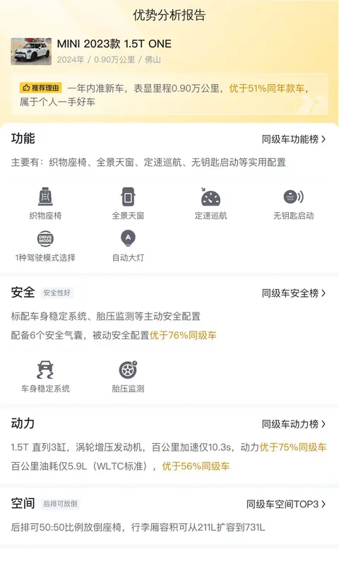 买二手车嘛,大家都想花最少的钱买最好的车,但每辆车的情况都不一样,价格也不一样,咱们客观分析一下这辆车。从优势方面讲,这辆二手MINI是原车主一手车,没有过户记录,车况相对简单明了,另外,这辆车通过了懂车帝的多项检测,确保不是事故车、泡水车或火烧车,进一步增加了购买者的安心感。从价格来看,这辆车目前报价15.98万,在市场行情中处于合理区间,如果车况检查无误,这个价格还是挺有吸引力的。毕竟开一年便宜将近6万。从劣势方面讲,这辆车目前跑了0.9万公里,算是正常里程,但考虑到这车一般后排坐人几率不大,这接近1年的使用,公里数不算少了。另外,外观有2项轻微划痕,内饰有2项脏污,这个看个人接受程度了,我感觉问题不大。总之,具体如何抉择,还需您自己衡量。希望我们的分析能够帮助到您,祝您购车愉快!