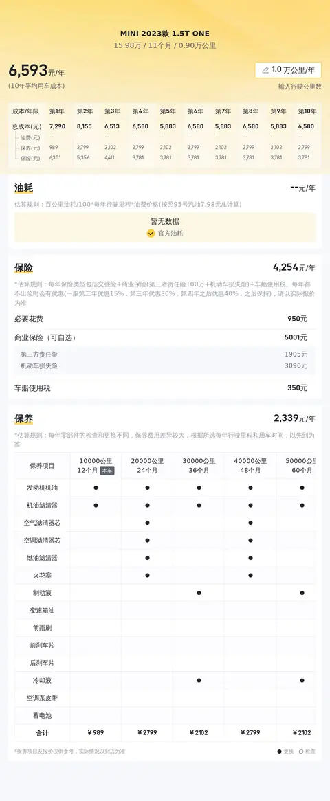 这辆二手MINI车源地和上牌地都是佛山,上牌时间是2024年2月,到现在车龄12个月,表显里程0.9万公里,这个里程数不算低了。车身颜色为白色,没有过户记录,属于原车主一手车,这点不错,毕竟过户次数过多的车辆,后期可能会存在一些未知的麻烦。新车含税价21.88万,目前二手报价15.98万。
