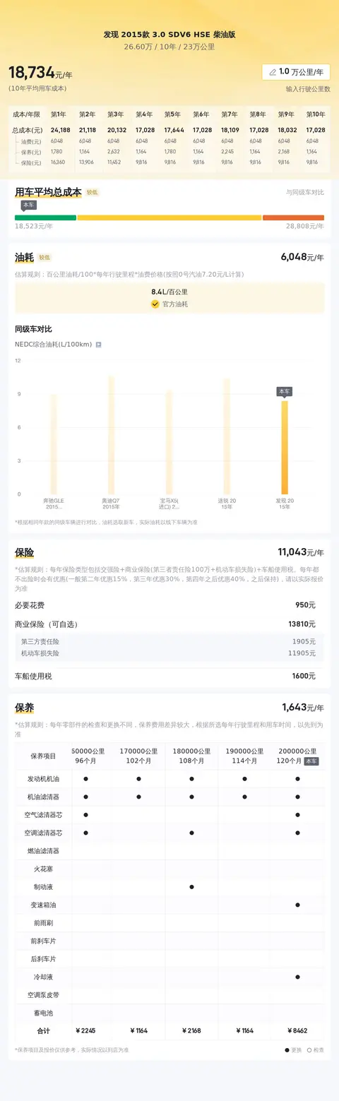 根据懂车帝官方的大数据分析,发现2015款3.0 SDV6 HSE柴油版的10年平均用车成本为20,186元/年。这一数据基于实际用户的反馈和市场情况得出,可以为消费者提供一个大致的参考。