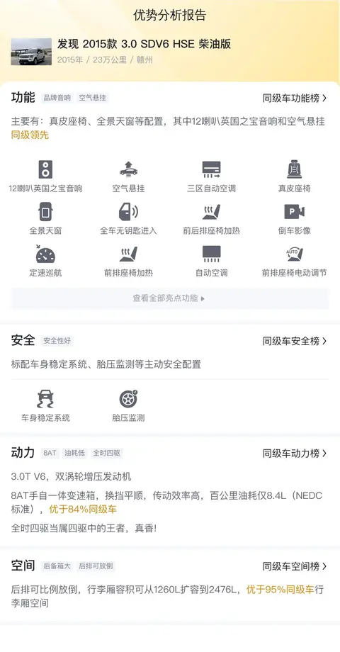 发现2015款3.0 SDV6 HSE柴油版在二手车市场上具有一定的知名度和口碑,售价相对较为平稳。消费者在购买时需要仔细检查车辆的车况、行驶里程、保养记录以及是否有改装等因素,并了解车辆的历史和使用成本等情况。只有综合考虑各种因素,才能做出明智的购买决策。
