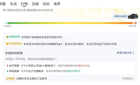 说完了车辆本身,咱们聊聊这辆车的市场行情价和用车成本。懂车帝利用强大的数据分析能力,统计出了这辆车在当前车况下的市场行情价为24.77-29.47万,该车报价26.88万,报价正常,同时本车目前售价26.88万,预计再行驶2年后可卖22万,约折价17.9%,保值率正常。