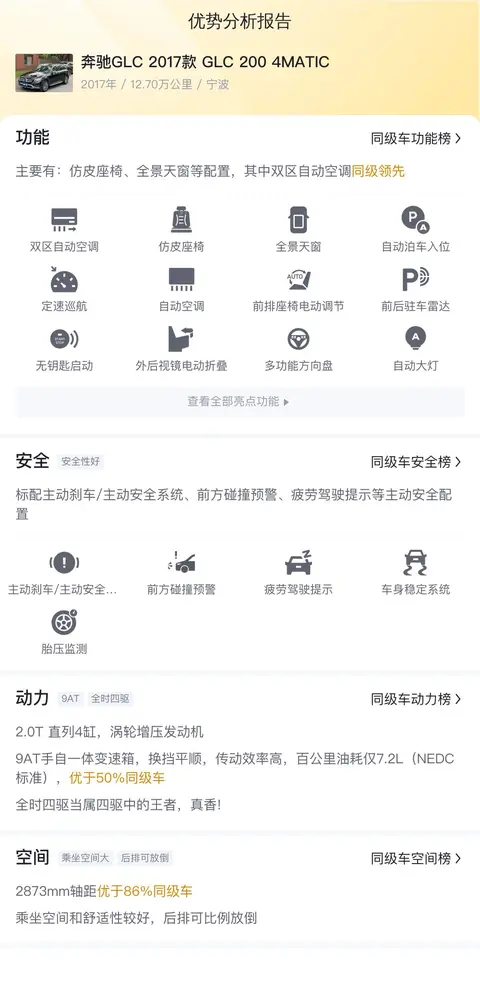 综上所述,奔驰GLC以其卓越的性能、精致的内饰、丰富的配置以及强大的品牌影响力,赢得了市场的广泛认可。无论是外观设计、内饰品质、动力表现还是智能科技,GLC都展现出了奔驰作为豪华汽车品牌的实力和魅力。今天说的这款二手奔驰GLC 2017款 GLC 200 4MATIC,报价12.38万,比新车含税价优惠30.86万,性价比较高,是一款值得考虑的二手车型。不过,购买二手车还是要综合考量,包括车辆的历史、使用状况、保养记录等因素,做出明智的选择。