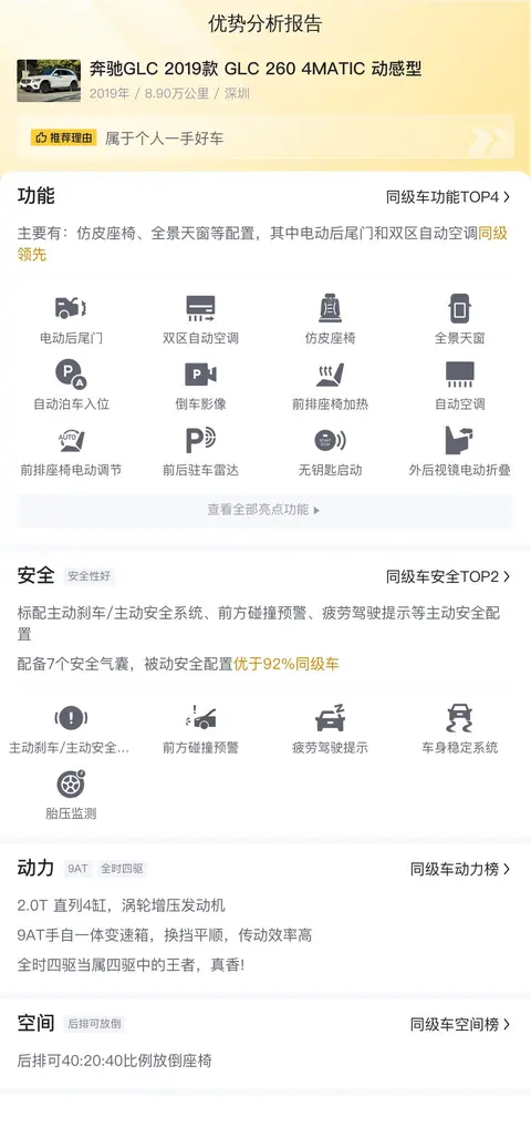 首先我们了解一下这辆车的基本信息,该车的具体版本是奔驰GLC 2019款 GLC 260 4MATIC 动感型,白色外观,2019年8月上牌,表显里程8.9万公里,京牌,目前在深圳售卖,新车指导价42.98万,二手车报价20.6万,过户次数:0次。