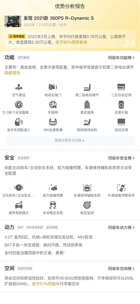 综上所述的新车含税价、用车成本、市场行情、优势分析、同款比价等数据仅供参考。在配置部分,因为二手车非标品,车辆可能会存在配置改装的情况,具体车况信息需要线下结合车辆实际情况进行综合参考。