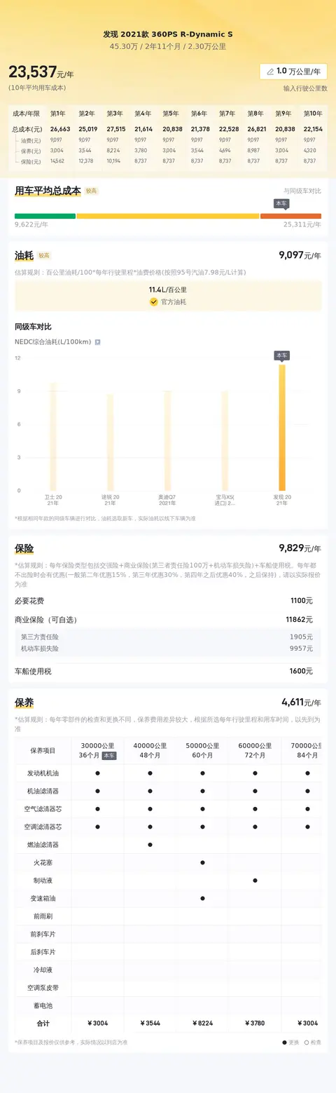 此外,按照懂车帝的大数据分析,这辆车的十年平均用车成本是23653元/年,因为同级车最低十年平均用车成本是19079元/年,最高是31833元/年,所以适当。