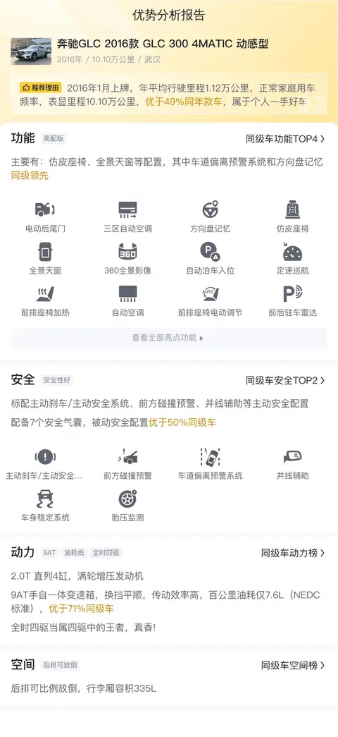 综上所述,这辆奔驰GLC 2016款 GLC 300 4MATIC 动感型表现不错,外观、内饰配置丰富,动力强劲,内饰状况良好,市场行情和保值率也较高。然而,由于没有详细的检测报告,无法准确评估车况,潜在的维修费用也无法预估。建议在购买前务必进行全面细致的检查,确保车辆的实际状况与描述相符。总体来说,如果车况符合描述,12.9万的价格还是不错的,毕竟开回家还是一辆奔驰!