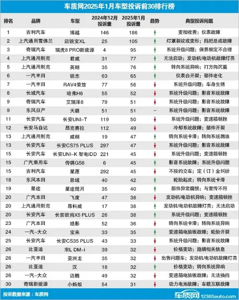其中,吉利旗下两款车型博越(图片|配置|询价)和星愿分别以186起和45起的投诉量位列榜单第一和第十。