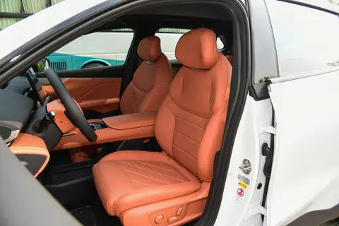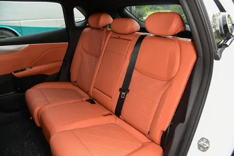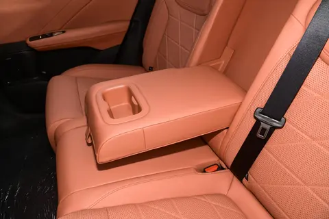 座椅是仿皮的,符合这款车的定位。配了四边形的纹路还做了打孔处理,值得表扬。不但视觉上拉高了座舱的档次感,通透感也可以。配置也有惊喜。主驾的座椅是8向的电动调节配了腰托,有加热和通风功能。副驾座椅也给到了腿托。就定价看,配置确实高了。坐着也很舒服。前后座椅的坐垫都有500mm的长度,腿部支撑很足。后排的倾角设计也挺讲究的。坐上去人往后靠,背部挺贴合的支撑感不错。中间是带一个扶手。 杯架,后排出风口和充电器接口都有。