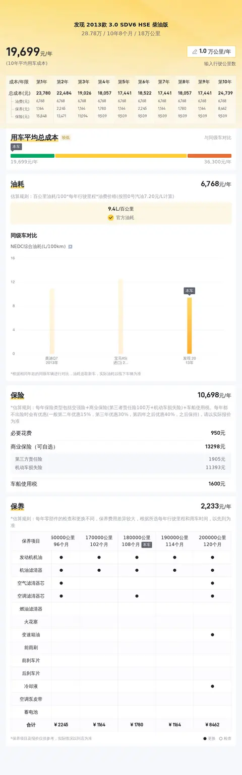 买二手车不比买新车,因为二手车基本都是开了一些年的,或多或少会有一些故障小问题,当然也有捡漏的时候碰到车况非常完美的车型,但大多数时候还是要做好心理准备的。暂且不说修理费,光是平时用车的成本也会因车而异有所不同。下面是我们根据这辆车的情况所做的大致估算,希望可以帮助到您。