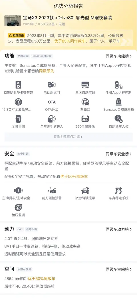 这辆宝马X3具有多项优势,包括领先的动力性能、优异的操控性和稳定的市场保值率。特别是在动力性能方面,它所搭载的2.0T发动机在同级别车型中表现突出。此外,车辆的操控性也得到了广泛认可,驾驶起来稳定而灵活。然而,它也存在一些缺点,如用车成本较高和可能出现的维修保养问题。由于宝马X3采用了许多高科技配置和精密机械部件,其维修保养成本可能会相对较高。而且,作为一款豪华品牌车型,其零部件价格和维修费用通常也会更高。在对比相同年款的国产版车型时,潜在的维修费用更高的问题就显得更加突出。因此,在购买前,准车主需充分考虑自己的经济能力和使用需求,做好长期维护的准备。