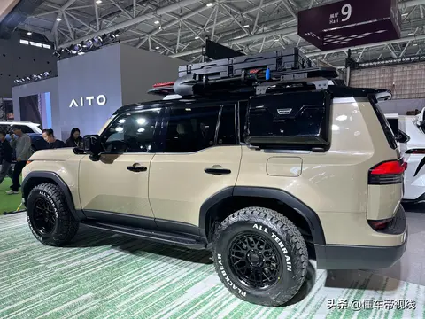 根据实车图来看,雷克萨斯GX550h改装版基本延续了OVERTRAIL远峰版车型设计,不过该车换装全新造型的18英寸黑色轮辋以及全地形轮胎,全地形轮胎规格为265/70 R18。值得注意的是,该车配备有侧爬梯以及侧背包,车顶装备有置物平台。