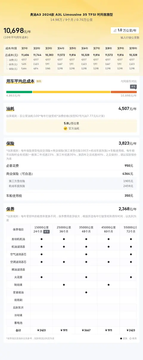 关于这辆车的用车成本,按照同级别车型平均水准计算,考虑到保险费用与保养费用,以及燃油消耗,大约每年在1.1万元左右。至于价格方面,这辆车目前的售价是14.98万,在同级别车型中价格处于较低的一个水平,您可以放心,这个价格绝对划算。