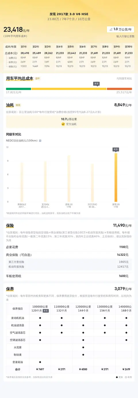 这款路虎发现的年度用车成本,包括保险、保养和其他费用,大约在2.3万元左右,具体支出视使用情况和所在地区政策而定。